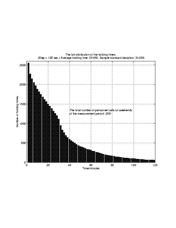 The tail distribution of the holding times in the staff modem pool on weekends of January 1998.