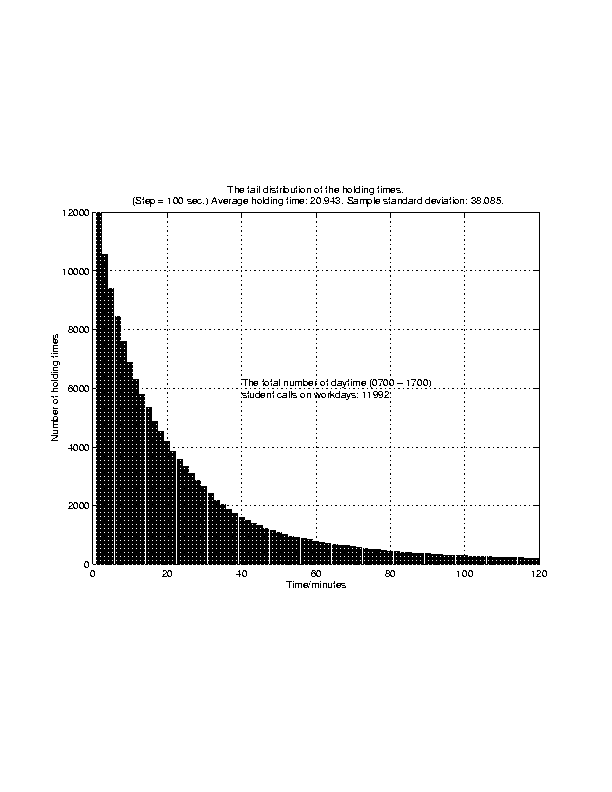 The tail distribution of the holding times in the student modem pool on weekdays (07.00-17.00) of January 1998.
