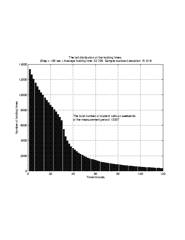 The tail distribution of the holding times in the student modem pool on weekends of January 1998.