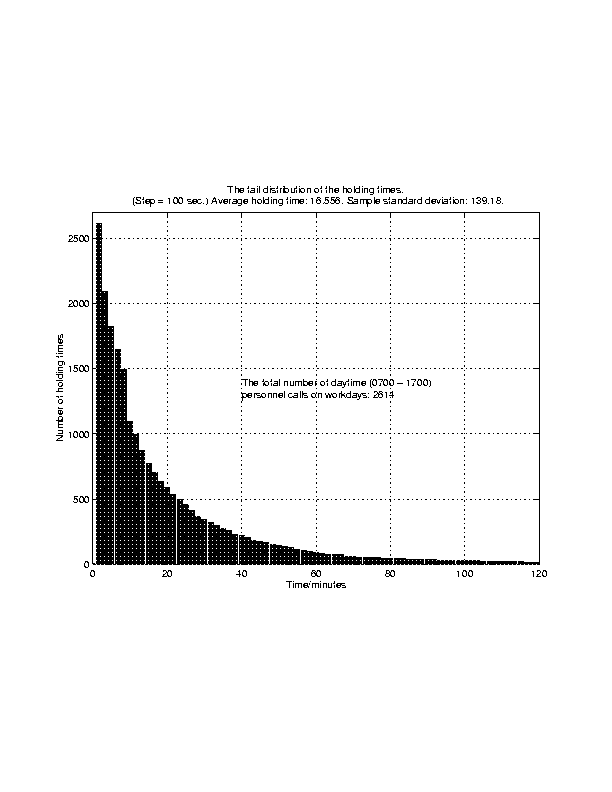 The tail distribution of the holding times in the staff modem pool on weekdays (07.00-17.00) of June 1998.