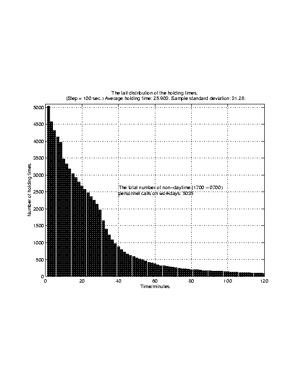 The tail distribution of the holding times in the staff modem pool on weekdays (17.00-07.00) of June 1998.
