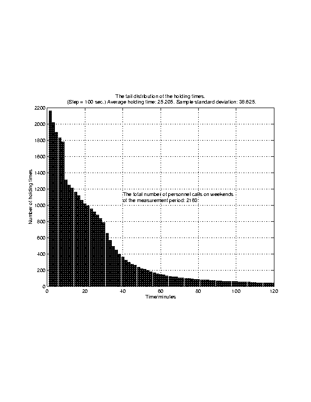 The tail distribution of the holding times in the staff modem pool on weekends of June 1998.