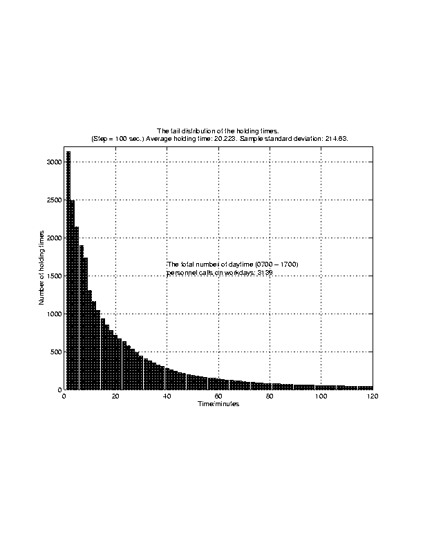 The tail distribution of the holding times in the staff modem pool on weekdays (07.00-17.00) of September 1998.