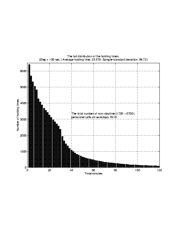 The tail distribution of the holding times in the staff modem pool on weekdays (17.00-07.00) of September 1998.