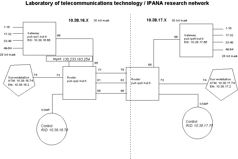 The network consists of four Ipsilon IP switches and two Ipsilon ATM1600 ATM-switches.In addition the peripheral devices include two Sun workstations with Zeitnet IFMP-compatible NICs and measurements are made with Adtech AX/4000 and Radcom Prism.