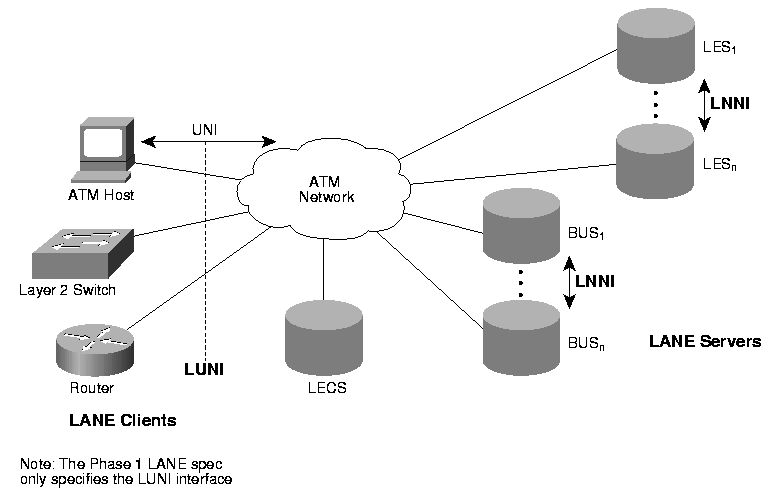 LAN emullaation versio 1.0 määrittelee ainoastaan palvelun käyttäjärajapinnan LUNI:n. On siis määritelty rajapinta LEC:n ja muiden LAN emulaation komponenttien välille. Verkkorajapinta LNNI, jonka läpi LANE palvelinkomponentit kommunikoivat keskenään on jätetty täysin avoimeksi, jolloin sen toteutus ja ominaisuudet jäävät laitevalmistajien ratkaistavaksi. Koska verkkorajapintaa ei ole määritelty, ei LANE suoraan tue usean LES:n tai BUS:n ratkaisuja, mistä voi aiheutua suorituskyky- ja luotettavuusongelmia suurilla asiakasmäärillä. Valmistajilla on kuitenkin vapaat kädet kehittää em. ominaisuudet käyttäen omia protokolliaan.