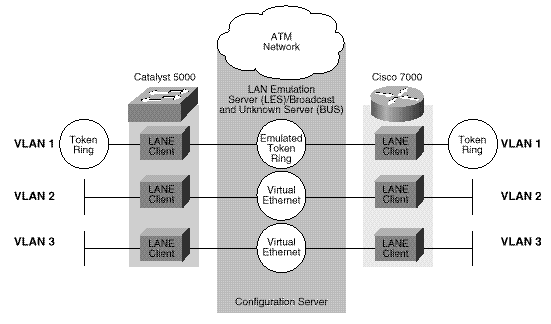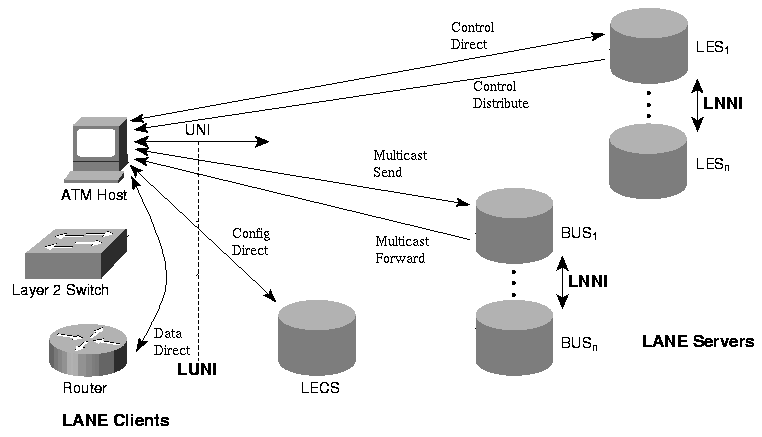 LAN emulaatio -palvelu ATM-forum:in LAN emulation over ATM - Version 1.0 -määrittelyn mukaan sisältää seuraavat komponentit.
