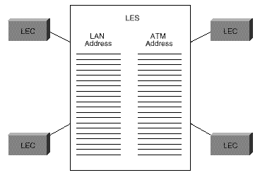 LES (LAN Emulation Server) toteuttaa emuloidun lähiverkon ohjaustoiminnon. Jokaista ELAN:ia kohden on järjestelmässä täsmälleen yksi looginen LES. Johonkin emuloituun lähiverkkoon kuuluminen määrittyy sen mukaan mihin LES:iin verkon komponentti on rekisteröity tai rekisteröitynyt. LES ylläpitää tietokantaa siihen rekisteröityneistä LEC:sta, ja osallistuu ATM-osoitteiden ratkaisuun.