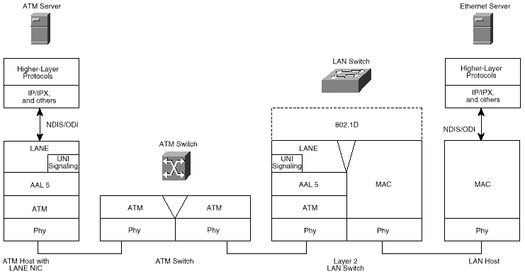 Läytettäessä LAN emulaatiota, perinteisessä lähiverkkoympäristössä pitää pystyä muodostamaan kolmenlaisia yhteyksiä: